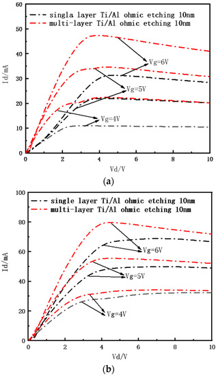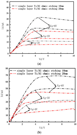 Figure 7a,b shows the output characteristic curves of conventional and ring-gate structure devices with a 10 nm ohmic groove etching using multi-layer Ti/Al and single-layer Ti/Al electrode respectively. It can be found that both devices exhibit better output characteristics with multi-layer electrodes, when Vg = 6 V, the Idmax of multi-layer conventional device comes to 47.38 mA, which is 51.3% higher than that of the single-layer device (31.32 mA); in ring-gate multi-layer electrode devices, the maximum output current reaches 79.63 mA, which is 15.7% higher than that of the single-layer electrode device (68.80 mA). This is because when the multiple Ti/Al/Ti/Al/Ti/Al/Ni/Au is subjected to rapid thermal annealing, the Al material can react with Ti more fully, which is beneficial to consume Al atoms and Ti to form low-resistance Ti-Al alloy, reducing the generation of Al-Au alloy particles, which will increase the surface roughness and the contact resistance of the electrode [11,12,13,14,15], thus can make the electrode metal after annealing more uniform and stable [11]. Therefore, the device using multiple Ti/Al electrode can obtain better ohmic contact characteristics and thus generate a larger output current.