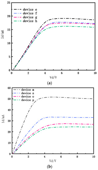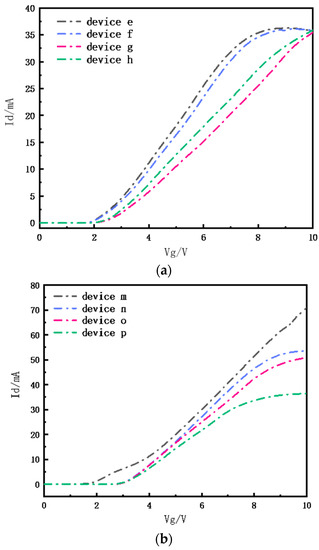 Firstly, keep the gate-drain spacing at 11 μm and the gate-source spacing at 5 μm, use Ti/Al/Ni/Au alloy as source, drain electrode meterials, and Ni/Au as gate electrode material, the etching depth under the source, drain is set to 10 nm, we fabricated conventional and ring-gate structure HEMT devices with gate lengths of 3/4/5/6 μm respectively. These devices are grouped as shown in Table 2, Table 3, the output and transfer characteristics are tested. Figure 8a shows the transfer characteristic curves of the conventional structure with Lg of 3/4/5/6 μm respectively. It can be seen that with the increase of Lg, the Vth of the device shows a positive shift trend. When Lg = 3 μm, the Vth = 1.53 V, when Lg increases to 6 μm, Vth increases to 1.7 V. In Figure 8b we can observe the same trend among the ring-gate structure devices, and the positive shift of Vth is more obvious. The Vth of device p with Lg of 6 μm is about 2.5 V, while the Vth of device m with Lg of 3 μm is only about 1.5 V.
