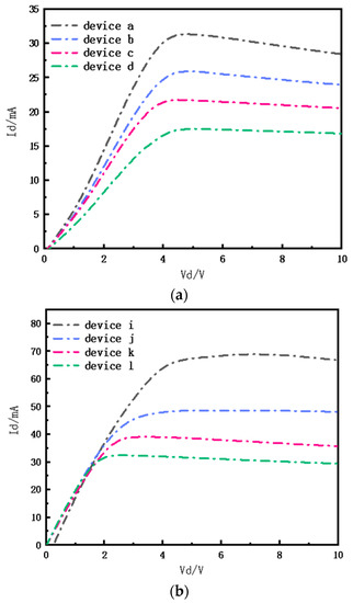 The transfer characteristic curves of conventional and ring-gate HEMT devices are shown in Figure 10a,b when Lgd is 7/11/15/19 μm, respectively. It can be found from the figure that changing Lgd has no obvious effect on the Vth of devices of the two structures; When Vg = 6 V, the output characteristic curves of conventional and ring-gate devices are shown in Figure 11a,b. It can be seen that among conventional devices, device a has the best performance, its Idmax is 31.32 mA when Vd = 4.7 V, which is 79.07% higher than that of device d (17.49 mA); the same trend is also shown in ring-gate devices, the drain saturation current of device i with Lgd = 7 μm reaches 68.80 mA, which is 113.7% higher than that of device l (32.3 mA) with Lgd = 19 μm. This is because the reduction of the source-drain spacing effectively increases the number of additional polarized charges in the gate-drain region, thereby enhancing the polarizaiton coulomb field (PCF) scattering effect on the 2DEG electrons under the gate, making the gate-source channel resistance and the gate-drain channel resistance increase with the decrease of gate bias voltage. Therefore, reducing the source-drain spacing can effectively enhance the PCF scattering effect, thereby improving the output characteristics of the device [18].