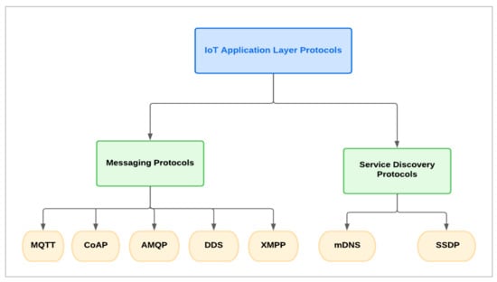 In this section, we present the IoT application-layer protocols, which are considered the main component of the IoT environment as shown in Figure 3. In addition, these protocols are the backbone for all communications between IoT devices and between IoT devices and network infrastructure [10]. The two key functions of these protocols included (1) exchanging the messages and sharing data between IoT devices and (2) offering the service discovery by detecting IoT devices. Based on this, these protocols were divided into two categories as follows: