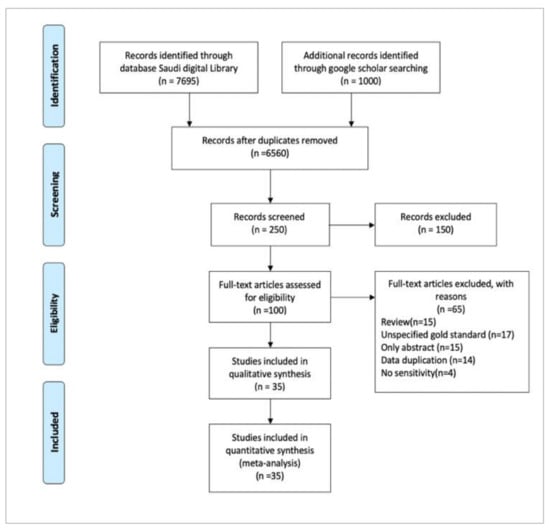 To conduct this study, we followed PRISMA as it progressed through four stages. For the identification stage, we searched the Saudi digital library database and the Google scholar database for papers describing cybersecurity threats and IoT, and for papers published between January 2016 and April 2022. Among the exclusion criteria were papers not written in English, papers not directly related to cybersecurity threats on IoT, and papers not available online. The source types were academic journals or conference papers. At the identification stage, 8695 papers were identified; after removing duplication, 6560 papers remained. Out of 250 papers screened for title and abstract, 150 were excluded for not fitting the criteria closely at the screening stage. At the eligibility stage, 100 studies were eligible to move on to the final stage. A total of 100 articles were included in the inclusion stage; of these, 65 were eliminated, leaving 35 for further review. Figure 4 illustrates the selection of previous studies.