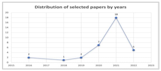 Table 3 lists the publication years of the selected papers from 2016 to 2022, and as shown in Figure 5, most of the selected papers were published in 2021.