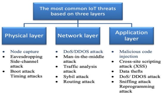 - Deogirikar, J.; Vidhate, A. Security attacks in IoT: A survey. In Proceedings of the 2017 International Conference on I-SMAC (IoT in Social, Mobile, Analytics and Cloud)(I-SMAC), Palladam, India, 10–11 February 2017; pp. 32–37. [Google Scholar]