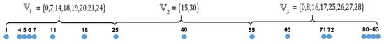 Here, d is the unit inter-element spacing, set as a half wavelength unit, and it will be omitted in this paper. Since a nested array has two subarrays, the total number of physical sensors . Figure 1 shows a nested array with the total sensor number . NA’s DCA is hole-free in the range .