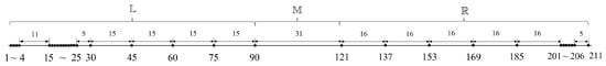 where . The elements of and represent the distance to the leftmost array element of . The elements of represent the distance to the rightmost array element of . The number of ANA sensors R is still . As long as and are reasonably distributed, a higher DOF can be achieved. Figure 2 shows an ANA configuration with the total number of sensors . Its DCA is consecutive in .