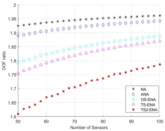 where is the physical aperture of the sparse array. The smaller the DOF ratio, the higher the DOF and the better the effect with R fixed. Figure 6 shows the DOF rate of five configurations of NA, ANA, OS-ENA, TS-ENA and our proposed TS2-ENA nested-like arrays. The variation range of R is from 50 to 100. We select the optimal configurations for comparison of all structures. From this picture, we can understand that the DOA estimation capability of the proposed configuration TS2-ENA is the best.