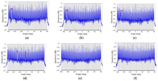 Simulation diagram of DOA estimation for six sparse arrays. The red circle indicates that there is a wrong spectral peak at this position. (a) NA. (b) ANA. (c) MISC. (d) OS-ENA. (e) TS-ENA. (f) TS2-ENA.
