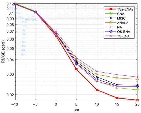 Figure 9 shows the SNR versus number of sensors. The RMSE results is different from to 15 dB. In this part, K is set as 1000. It can be seen from the result that as the SNR increases, the influence of noise will decrease, resulting in the RMSE of each array being smaller and the accuracy of estimation improved. At about 10 dB, CNA further reduces its RMSE due to the inhibition of mutual coupling. Meanwhile, other structures basically depend on the DOF with RMSE gradually decreasing. The RMSE of our new structure TS2-ENA is consistently the smallest, which indicates that its estimation accuracy is better than other array models.