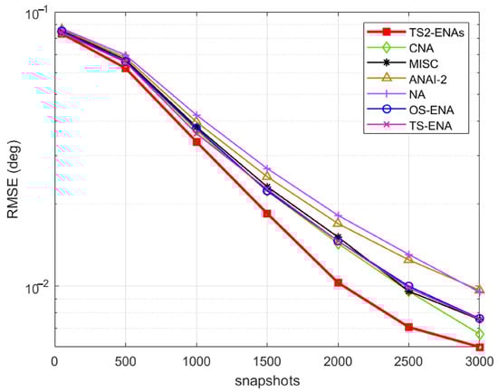 In Figure 10, we give the the parameters with dB and set snapshots from 1 to 3000. In this picture, we can conclude that with the continuous expansion of snapshots and sampling data, this RMSE will gradually decrease and then tend to be stable. When K is small, the error of nested-like arrays is obviously large. When K is larger than 1500, the RMSE of each structure will decrease significantly. Especially, the RMSE of TS-ENA and CNA will decrease significantly. Since CNA is optimized for mutual coupling and TS-ENA has the highest DOF, they both have good simulation performance. The RMSE of our proposed configuration is the smallest all the time.
