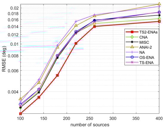 Figure 11 shows that as the number of measured sensors increases, the minimum mean square error increases gradually. This experiment illustrates the RMSE versus number of sources from 100 to 200 with , dB. Since the DOF of each structure is different, the RMSE will also increase when the number of detected sources is large. With the increase of number of sources, the array with the smallest influence of error rate is TS2-ENA, which is followed by CNA, MISC, TS-ENA, OS-ENA and ANA.