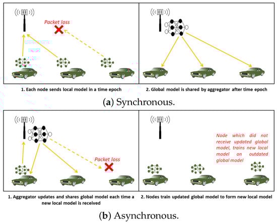 FL can be carried out in two modes: synchronous and asynchronous [5]. In synchronous FL, nodes are given a time limit in which they submit their local models. A global model is formed after a time epoch. In asynchronous FL, nodes can send their models at their own convenience. A global model is updated each time a new model is received, thereby resulting in high communication efficiency [13]. However, a node may not be able to upload its local model in a fixed time epoch due to high mobility in a vehicular network, as shown in Figure 2a. On the other hand, in asynchronous FL in the IoV, it is possible that a node loses the connection with the aggregator and is unable to receive every update in the global model. It may continue training its local model on the basis of an outdated global model, thereby leading to wasting its resources, as shown in Figure 2b. To increase accuracy and reduce packet loss, a modified synchronous FL can be used in the IoV in which the aggregator waits for a certain number of local models to be received instead of a time epoch. A semisynchronous solution leveraging the advantages of both approaches was presented in [13].