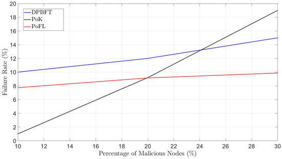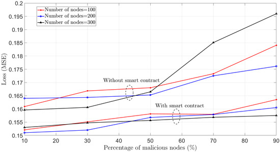 Table 1 lists a comparison of various solutions for blockchain-enabled FL that shows that the smart-contract-based PoFL solution covered incentive distribution, the impact of the increase in the number of nodes, and a comparison of the solution without blockchain [7]. In [15,16] and the proposed solution, the blockchain is utilized to provide security against malicious nodes. Therefore, all local models are verified through consensus to ensure that they are not deliberately trained to produce inaccurate results. The failure rate of [15,16] and the proposed solution in the presence of malicious nodes is shown in Figure 5. Failure rate refers to the degradation in performance of a solution, i.e., inaccurate traffic flow estimation in [15], inaccurate block addition in [16], and the percentage of nodes not receiving the message in our solution. Figure 5 shows that the failure rate increased significantly with the malicious-node percentage in [16]. PoFL resulted in the least failure rate as the percentage of malicious nodes increased in the network. At 30% malicious nodes in the network, the failure rate was at least 5% lower than that of other solutions.