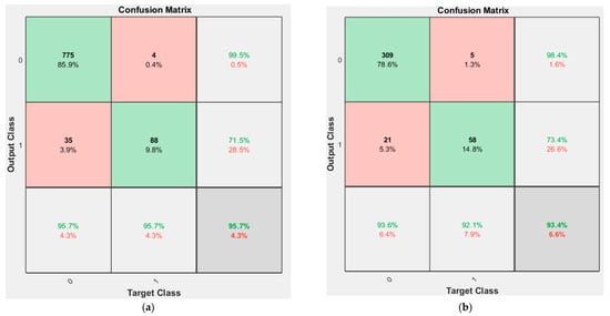 The confusion matrix [46] represents the iterative results of the actual and predicted data. The predicted data comprise the output after executing the model. In the confusion matrix, the rows represent the predicted results, and the columns represent the actual results. The diagonal cells indicate the match between actual and predicted. The non-diagonal cells show the cases where the test results are wrong. The right column of the confusion matrix shows the accuracy of each prediction class, while the bottom row of the confusion matrix shows the accuracy of each real class, and the bottom right cell of the confusion matrix shows the overall accuracy.