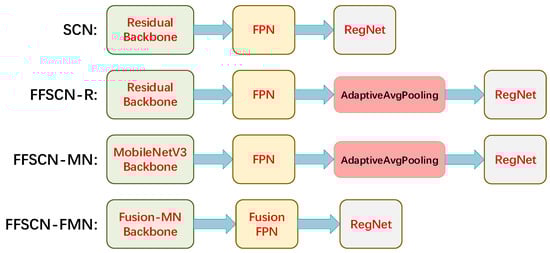 Next, Table 4 shows the complexity comparison between the FFSCN models and other deep-learning-based methods. Compared to FFSCN-R and SCN, by adopting the MobileNet backbone, the floating-point operations (FLOPs) and inference time cost of FFSCN-MN decreased obviously. Furthermore, by applying the Fusion FPN neck, the FLOPs and inference time of FFSCN-FMN decreased further than FFSCN-MN. Furthermore, even though the FLOPS of FFSCN-FMN were much larger than FCN and SigdetNet, they consumed a comparable inference time. Therefore, FFSCN-FMN improved the efficiency of SCN.