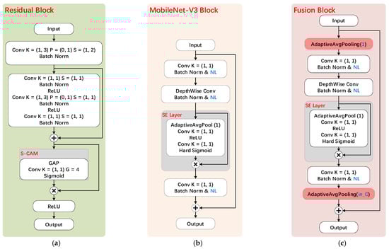 The basic block structure of the deep-CNN-based backbone network. (a) The Residual block. (b) The MobileNetV3 block. (c) The proposed Fusion block, consistent with the MobileNetV3 block, uses a different nonlinear (NL) activation depending on the layer, and in_C denotes the input channels.