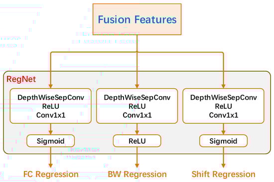 Figure 4 gives the RegNet head of this work, and we added a frequency center (FC) shift regression branch compared with that in the original SCN. Considering that we regressed the FC prediction in the 1/4 scale of the input length, a shifting bias exists when we set the target FC point as an integer. Therefore, the FC shift regression is to fix the bias, and it consists of the same structure as FC regression and BW regression, a depthwise separable convolutional layer [25] with 256 channels, rectified linear unit (ReLU) [39], and a 1 × 1 Conv with one channel in common.