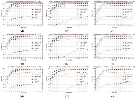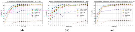 The multi-carrier and single-carrier modulation signal detection performances of our proposed FFSCN models and other deep-learning-based methods: (a1–a4) all modulation samples’ detection performance; (b1–b4) multi-carrier modulation samples’ detection performance; (c1–c4) single-carrier modulation samples’ detection performance. denotes the IoU threshold and increases from 0.6 to 0.9 from (1) to (4).
