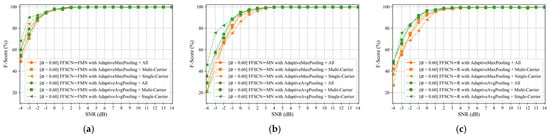 The effects of the two different adaptive pooling layer types used in the FFSCN models are depicted in Figure 9. When the sub-carrier SNR was larger than 2 dB, the two types of adaptive pooling layers performed comparably well in the three FFSCN models. However, when the sub-carrier SNR was lower than 2 dB, the models using the adaptive average pooling layer outperformed the models using the adaptive maximum pooling layer.