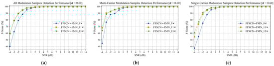 The multi-carrier and single-carrier modulation signal detection performances of different downsample times used in the FFSCN-FMN model: (a) all modulation samples’ detection performance; (b) multi-carrier modulation samples’ detection performance; (c) single-carrier modulation samples’ detection performance. Here, denotes the IoU threshold, and we fixed it to 0.6. We compared the performance of the FFSCN-FMN model using 9, 11, and 13 downsample times.