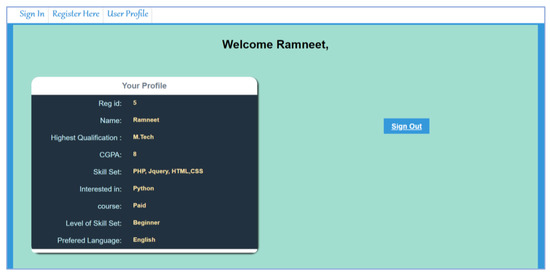 When a user logs in, there are three ways in which a user’s profile can be created via registration, uploading their Curriculum Vitae (CV), and access through LinkedIn. To develop a user profile, the first step is to fill out the registration form. The learner’s details will then be entered into the database. This interface was developed in PHP and MySQL and is used as a database. The next step is to click on the Sign In form, and now the user can log in using the username and password that were earlier assigned in the registration step. After filling in the credentials, the user is required to click on the login button. The steps are mentioned in Algorithm 1.