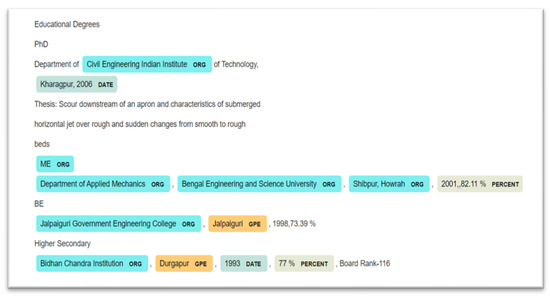The second step is to create a profile by uploading a CV. In this step, the CV is uploaded through the “Affinda API” option. In this step, PDF files are uploaded by a user on a website and, with the help of the Affinda API, parsing will be done and, further, the information will be saved into the database, as shown in Figure 8. The data will be received in text format and then it will be easy to manipulate that data using Regular Expressions and save them into the database. The steps are explained in Algorithm 3.