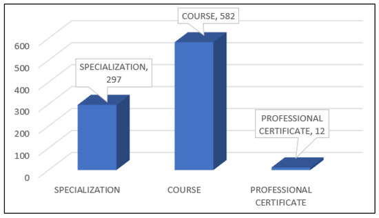 After analyzing the literature of MOOC courses, it is stated that among all the MOOC platforms, learners mostly enrolled in Coursera courses. To study the dropout rate of Coursera courses, a dataset is fetched from Kaggle.com that contains information on 891 courses. The dataset contains details of the total number of students enrolled in a particular course. Course_difficulty contains information regarding the level of the course: beginner, intermediate, and advanced. Certification_type contains information regarding the certification, including whether that course counts as a professional degree or not. Course_rating contains the rating of the course, and the course_dropout field contains the number of learners who left the courses after enrolment. In Figure 9, from 891 Coursera courses, 487 courses are offered to beginners, 385 courses are offered for intermediate learners, and 19 courses are for advanced learners. In Figure 10, out of 891 courses, 297 courses hold specialization, 12 courses offer professional certificates, and 582 courses help to enhance your skills.
