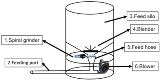 Figure 4 shows a diagram of the commercially available fish feeder. The fish pellets fall from the feed silo through the copper opening. Then, the small motor of the grinder pushes the spiral grinding rod to release the grinded fish pellets into the blower port. In addition, the copper opening can be fine-tuned through the adjustment rod of the grinder in order to achieve the purpose of controlling the rate of baiting. The fish pellets are stored in the feed silo, and then the fish pellets are blown out by the blower after the fish pellets are dropped through the abovementioned mechanism.