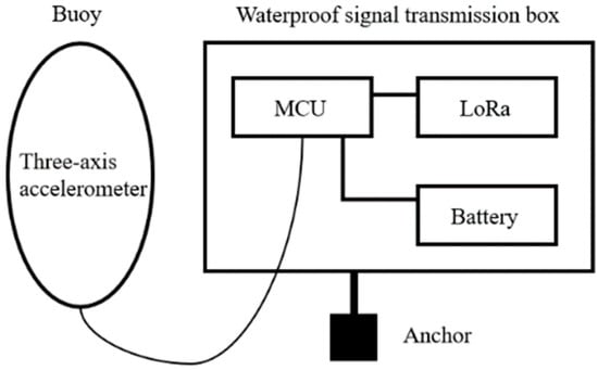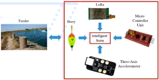 A three-axis accelerometer is placed in the customized buoy, which is used to sense the water surface fluctuations caused by the competition for food [16,17]. Information is transmitted to the waterproof signal transmission box through inter-integrated circuit, and the value is returned by the three-axis accelerometer, integrated with a single low-cost chip. Then, the data are sent back to the shore through the wireless transmission module. The architecture of the custom buoy and controller is shown in Figure 7. The system uses a waterproof box to prevent water from entering the electronic components and transmission modules inside. The bottom of the waterproof box is anchored to prevent the AIoT precision feeding management system from being pushed away from the sensing area due to strong winds or excessive competition for food.