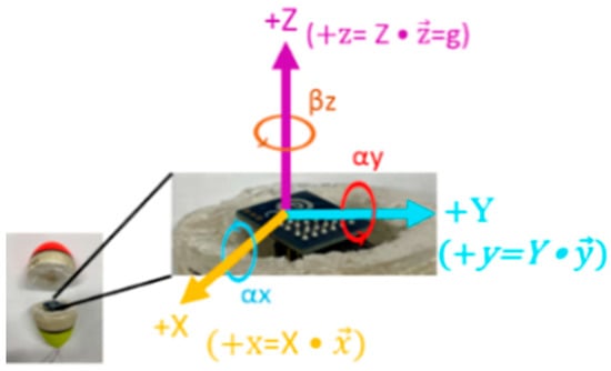 The measurement method records the response and the rotation angle of the three-axis accelerometer. The device under test (DUT) is separately rotated in the direction of the +X, +Y, and +Z. The planes of rotation perpendicular to the three orthogonal axes are αx, αy, and βz, as shown in Figure 8. Yellow, blue, and purple arrows represent the orthogonal unit vectors +x, +y, and +z in the stationary position, which is defined as the dot product of the unit vectors (+X, +Y, +Z) in the stationary position and the variation in the vectors (, , ) [18].