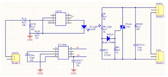 This system is an optocoupler voltage controller parallel-connected AC busbar system [22,23] using the DC 5 V PWM signal to control the 110 V AC system. here, a new control method for controlling the voltage is proposed. The control law is to sense the ratio of the input voltage to the output voltage and use the two sensed loops to correct the input current after the calculation. The input voltage can change the power according to the output ratio. The main purpose is automatic operation in the open and closed circuit, which means switching the circuit state to a high speed to reduce the AC voltage. This can reduce the total current harmonic distortion rate and improve the power factor. Figure 9 shows the optocoupler AC voltage controller circuit designed for this system, in which an µA741 is used as the stable input voltage. Since the µA741 requires positive and negative 5 volts DC, an ICL7660 is used to convert the positive 5 volts to negative 5 volts. Figure 10 depicts the actual circuit board. The part on the left shows the 5 V power input and the 5 V PWM control signal input. The part on the right shows the AC 110 V input and the AC voltage output after the voltage modulation.