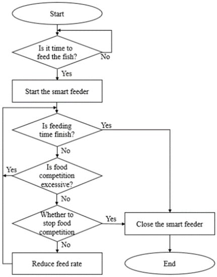 The system is designed to control the feeding time and fish pellet application. During the feeding process, the system judges whether the fish are full according to the received data. If the fish are still active, the fish feeder will not slow down. If the received data indicate that the fish’s action has gradually eased, the single-chip control optocoupler controller will be activated. In this way, the speed of the grinder inside the fish feeder is reduced to slow down the rate of spraying of the fish pellets. If the feeding upper limit time is reached, the control system will stop the action of the fish feeder.