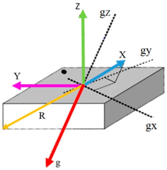 The gravitational acceleration and components form a right triangle, as shown in Figure 13. The third side of the right triangle is formed by the gravitational acceleration, and the component gx is . The third side of the right triangle is formed by the gravitational acceleration, and the component gy is . The third side of the right triangle is formed by the gravitational acceleration, and the component gz is . According to the Pythagorean theorem, this can be expressed as: