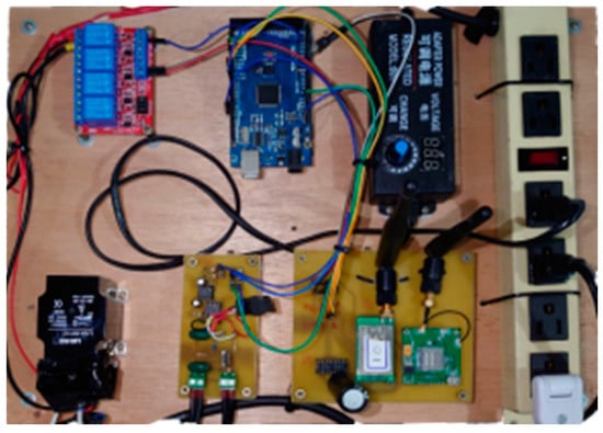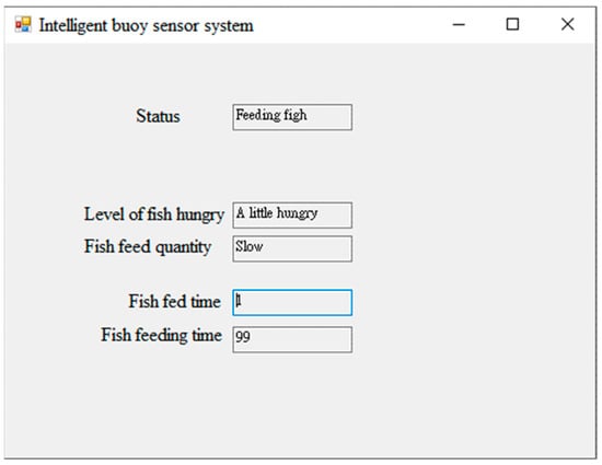 The purpose of this article is to propose an AIoT precision feeding management system to improve on the existing automatic feeding system on the market. It can achieve the effect of reducing the costs of labor and fish pellets [26,27]. Moreover, the AIoT precision feeding management system also has the advantage of being easy to install, allowing the fish farmer to easily replace or move the equipment. This system can help the fish farmer to fully achieve intelligent feeding and use the sensing circuit to remind the feed silo of insufficient fish pellets. The AIoT precision feeding management system is placed in the spraying area in order to measure the intensity of the water surface fluctuations when the competition for food starts, as shown in Figure 14. The LoRa is used to transmit data to the control circuit of the fish feeder, as shown in Figure 15. Through the control circuit of the fish feeder, the system can judge the degree of competition for food and control the switch of the fish feeder to adjust the speed of feeding. The state of the AIoT precision feeding management system, the intensity of the fish pellet spraying, the fish feeding time, and the maximum amount of time remaining for feeding can also be monitored by the computer, as shown in Figure 16 [28,29].