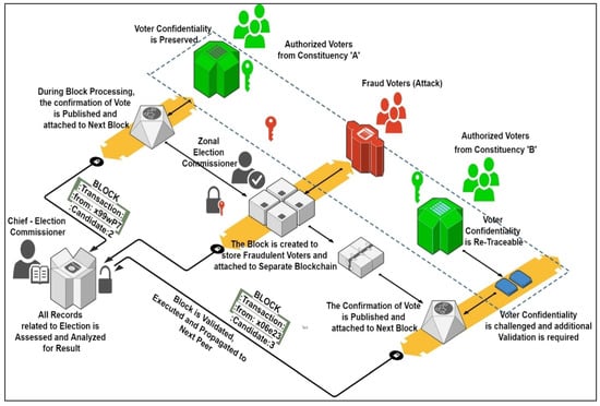 The perception associated with the casting of a vote by authorized voters can be visualized in Figure 2, that justifies the usage of Blockchain technology in such a system [20,21]. When a fraud voter penetrates the system through fake credentials it can immediately be reported at the zonal office by authorities. Such malicious activities can easily be determined through Blockchain technology [22]. The first block called genesis block is created with legitimate data associated with transaction identity, source/destination address, voter/candidate details, etc.