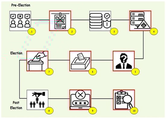 A glimpse of Election Security: There are three stages in an election process: pre-election, election, and post-election. There are several steps that are followed in an election process, as shown in Figure 3. The process also contains several vulnerabilities which need to be identified to prevent future attacks.