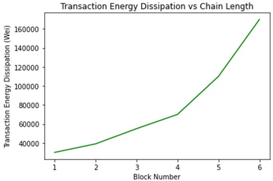 Decentralization with security and privacy-preserving features can be of primordial importance for its application in activities of mass participation as a general election [46,47]. The statistical analysis of different parameters of any public Blockchain should be considered in order to facilitate the process more efficiently. One of the key challenges which is ubiquitous to such public Blockchain is the cost of deployment. However, in this case the principal aim is to achieve optimized security and reliability. In Ethereum Blockchain, all the programmable transactions require some charges for ensuring safety in the networks and to overcome computational challenges. All operations such as computations, smart contract deployment and storage on the EVM require fees to complete the tasks. In our case with some initial fluctuations, we have observed throughout consistency in the chain length and the transaction energy dissipation. However, the charges are expected to increase with the deployment of more complex smart contracts, which in turn would result in making the entire process comparatively expensive, as shown in Figure 6.