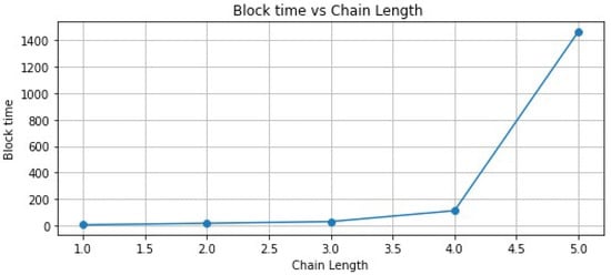 Block time is the length of time it takes to create a new block in a Blockchain. In an election process block time could be one of the decisive factors for the successful implementation and adoption of such a system. We have observed that the block time is expected to increase exponentially with the chain length by measuring it at an interval of one block, as shown in Figure 7. One of the main factors which influences the block time is the difficulty level of the network. In Ethereum homestead released Blockchain the level of difficulty is calculated using the following procedure: where//denotes integer division and 2** denotes the two to the power operation. The int function returns the largest integer less than or equal to a given number: