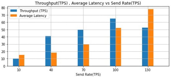 The proposed mechanism can be deployed to any other Blockchain with lower gas fees to make the process more cost effective, provided it is open-source, reliable and meets the protocol and security standards for the execution of a general election. We have also made an attempt to estimate the variation of throughput (transactions per second, tps) and average latency of the Blockchain with the send rate (tps). Transaction throughput may be defined as the measure of how fast a Blockchain can process a particular transaction. Blockchain network latency is the time between submitting a transaction to a network and the first confirmation of acceptance by the network. An analysis of such parameters can be a decisive factor, particularly when the chain length is very large. In our case we have found a strong correlation in the variation of throughput and average latency with the send rate (tps) of the chain. We evaluated the performance of the system over different transaction sending rates (10–130 tps). Although the average latency showed a steady increase with the increase in the transaction send rate, the throughput increased till the transaction send rate increased to 100 tps and then the growth rate slowed down, as shown in Figure 8.