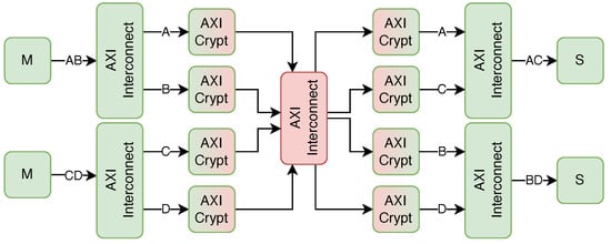 In this complex example, any of the two masters can access any of the two slaves. Every channel has its key/IV combinations, thus securing all four communication channels (A, B, C, and D). The system can also include non-secure channels or any other combination by suitably extending the central AXI interconnect.