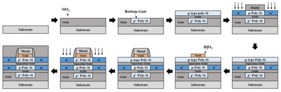 Figure 2 shows the main fabrication steps of a proposed device crystallized via excimer laser crystallization (ELC) [18]. First, SiO2 is deposited and the bottom gate is etched. Second, amorphous silicon (a-Si) is deposited by LPCVD and activated by excimer laser irradiation to form a poly-Si bottom gate. Third, SiO2 is deposited to form a bottom gate oxide. Fourth, after deposition a-Si through LPCVD, a channel layer is formed through ELC. Fifth, a hard mask is formed through SiO2 deposition and etching. Sixth, ion implantation is performed to form the n-type source and drain of the channel layer. Seventh, SiO2 is deposited to form a separation oxide. Eighth, after deposition a-Si by LPCVD, a storage layer is formed through ELC. Ninth, the top gate oxide is formed through HfO2 deposition and etching. Tenth, the metal top gate was deposited. Finally, ion implantation was performed to form the n-type source and drain of the storage layer. The device can be fabricated through the above process. In addition, through silicon via process (TSV) is performed to connect the channel layer and the storage layer. The stack structure requires high temperature processing, which can threaten dopant diffusion. These manufacturing challenges can be overcome using ELC.