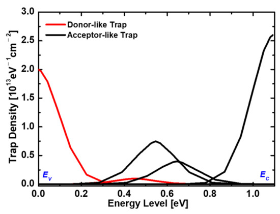 The work function of the top gate is 5.20 eV. The top gate work function increases the energy band of the storage layer, thereby generating a potential well that can store additional holes. The proposed 1T-DRAM consists of an 8 nm thick storage layer and the channel layer. The doping concentrations of the storage and channel layers are 1 × 1018 and 1 × 1016 cm−3, respectively, and that of the source/drain regions is 1 × 1020 cm−3. The channel length is set to 70 nm. A long channel is used because the longer the channel, the wider energy band of the hole storage area, which is advantageous for hole storage [19]. The top gate dielectric is designed with 3 nm thick HfO2. This is because the high dielectric constant of 22 increases the effect of the top gate controllability. Accordingly, the effect of the top gate work function on the storage layer is increased, so that the hole can be stored more effectively. For high accuracy, physical models such as Fermi-Dirac statistical, Shockley-Read-Hall (SRH) recombination, Auger recombination, nonlocal BTBT, and trap-assisted tunneling (TAT) models, doping-dependent and field-dependent mobility models, bandgap narrowing model, and quantum confinement effect were used in the simulations [20]. The design and analysis of the device were performed using Sentaurus technology computer-aided design (TCAD) simulation tool. Furthermore, the GB trap distribution of poly-Si was used as the calibrated data, which is reported in [15] (Figure 3).