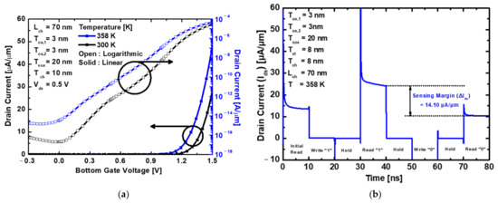Figure 4a shows the drain current (Ids) versus gate voltage (Vgs,B) transfer characteristics of the proposed device. At different temperatures of 300 K and 358 K, the threshold voltage (Vth) is 1.00 V and 1.12 V, respectively. The heavily doped poly-Si bottom gate performs the conventional MOSFET operation. Although the gate controllability is reduced compared to that of the metal-based gate, this gate structure can be easily fabricated in a 3D stacked manner.