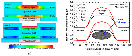 Figure 6a shows the hole density of the proposed device during the hold operation. The hold “1” state is defined after a program operation, and the hold “0” state is defined after an erase operation. As shown in Figure 6a, the hole density is different between hold “1” and hold “0” states. Figure 6b shows the energy band diagram of the storage layer during hold “1” and hole “0” operations in the storage layer. In the hold “1” state, an additional positive voltage is applied to the storage layer by the stored excess holes, reducing the potential barrier than in the hold “0” state. Moreover, a hold voltage of Vgs.T = −0.3 V is applied during hold operation to store excess holes more effectively.