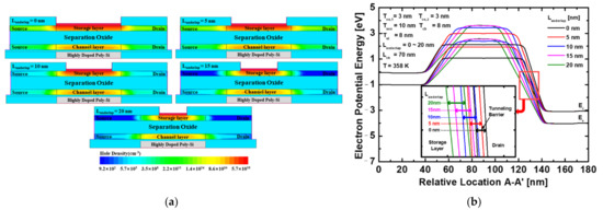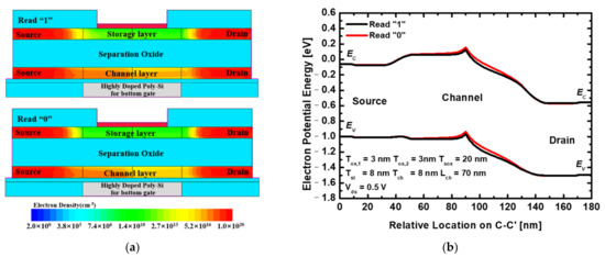 Figure 7a shows the electron density of the proposed device during the read operations. During the read operation, the current flows in the channel layer when Vgs,B = 1.3 V and Vds = 0.5 V. Figure 7a shows the difference in electron density in the channel layer. As shown in Figure 7b, when excess holes are stored in the storage layer, they affect the potential barrier of the channel layer and have the same effect as that of lowering of Vth by applying an additional voltage. However, after the stored holes are erased, the potential barrier of the channel layer increases owing to the low hole density of the storage layer. This causes a drain current difference between read “1” and read “0” states, defined as the sensing margin.