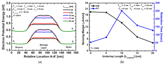 It is important to analyze the retention time among the memory performance of 1T-DRAM. The retention time is the time it takes for accumulated excess holes by recombination/generation during hold operation to return to a steady state after program/erase operation. The retention time of 1T-DRAM is defined as the hold time, which is 50% of the sensing margin. Figure 8a shows the hole density of the proposed device depending on the Lunderlap in the hold “1” state. As Lunderlap increases, the influence of the top gate on the storage layer and the source/drain junction decreases. Therefore, the recombination rate of the storage layer is reduced and the retention time is increased. However, when the effect of the top gate is reduced, it is difficult to form a sufficient tunneling barrier for BTBT to occur at the storage layer and drain junction during program operation, as shown in Figure 8b. This eventually decreases the hole density in the storage layer, as shown in Figure 8a. Moreover, the sensing margin decreases because the hole density in the storage layer is insufficient. On the other hand, when Lunderlap decreases, the tunneling barrier between the storage layer and drain becomes very thin and excess holes are generated, resulting in a decreased potential barrier of the storage layer, as shown in Figure 9a. This increases the rate of recombination between the storage layer and the source/drain so that the retention time is reduced. Figure 9b shows the sensing margin and retention time depending on the Lunderlap of the proposed device. At a temperature of 358 K, the sensing margin reached the peak value at Lunderlap = 0 nm, and the retention time reached the peak value of 251 ms at Lunderlap = 10 nm. In addition, this performance adheres to the international roadmap for devices and systems (IRDS) [21].
