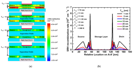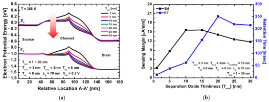 Figure 10a shows the SRH recombination rate of the proposed device depending on the Tsox in the hold “1” state. As Tsox decreases, the recombination rate increases because the source/drain junction of the storage layer is influenced by the electric field of the bottom gate. As shown in Figure 10b, when Tsox = 1 nm, the SRH recombination rate attains a peak value and decreases gradually. However, when Tsox exceeds 20 nm, the effect between the storage and channel layers and the retention time decreases. In terms of the sensing margin, as Tsox increases, the effect of the top gate work function on the channel layer gradually decreases, and the potential barrier of the channel layer decreases, as shown in Figure 11a. Consequently, the read current and sensing margin increase. However, when Tsox > 15 nm, the relationship between the storage and channel layers weakens. Therefore, the excess holes stored in the storage layer cannot be applied as an additional positive voltage. Therefore, the difference between the read “1” and “0” currents decrease. Figure 11b shows the sensing margin and retention time depending on Tsox of the proposed device. At a temperature of 358 K, the sensing margin achieved a peak value of 15.60 μA/μm at Tsox = 15 nm, and the retention time achieved a peak value of 251 ms at Tsox = 20 nm. Additionally, when Tsox = 20 nm, a sufficient sensing margin of 14.10 μA/μm is extracted. Accordingly, optimal memory performance is obtained at Tsox = 20 nm.