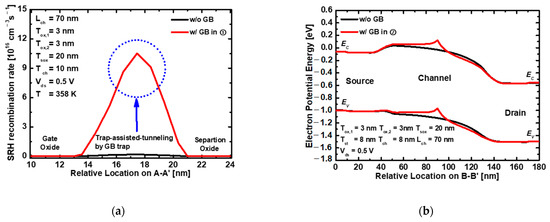 When a GB exists in the storage layer, the sensing margin is larger than that without a GB in the storage layer. This is because the difference between read “1” and read “0” increases owing to the hole/electrons captured by the GB trap of the storage layer. However, the retention time is reduced by the TAT mechanism through GB traps, as shown in Figure 13a. This is because the recombination/generation rates of hole are increased by the TAT mechanism. When a GB exists in the channel layer, electrons are captured in the region where the GB is located; therefore, potential barriers increase, as shown in Figure 13b. The increased potential barrier disturbs the current flowing from the source to the drain, significantly decreasing the sensing margin. In addition, the reduced sensing margin degrades the retention time. As a result, the memory performance of the proposed 1T-DRAM exhibits a superior performance of 28.58 μA/μm sensing margin and 648 ms retention time without a GB. Furthermore, when the GB exists in the storage and channel layers, the sensing margin and retention time are 14.10 μA/μm and 251 ms, respectively, which correspond to an excellent memory performance.