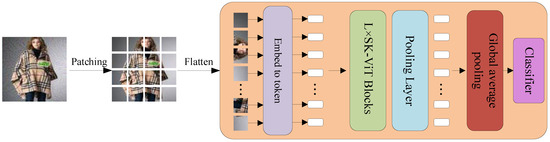 The proposed network model is shown in Figure 1. The SE module is introduced in Embed-to-token and the SK module is introduced in VIT module. The model structure is shown in Figure 2a,b.