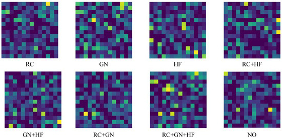 As shown in Figure 6, several different image enhancement methods in Table 6 are visualized and it is observed that when extracting features, each image enhancement method differs so little in showing important features that the deep neural network cannot extract them effectively. Therefore, several image enhancement methods and their different combinations are not effective in improving the robustness of the deep neural network in the face of adversarial sample attacks. Figure 6 also further validates the experimental results in Table 6.