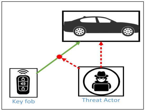 The early keyless system was developed based on static code sent from the key fob to the receiver, which is easily compromised by a thread actor who intercepts the transmitted signal and performs a replay attack [6]. A replay attack is also called a playback attack, when authorized legitimated data are captured and copied during transmission by a threat actor to be repeated for fraudulent purposes, as illustrated in Figure 1 [8]. Rolling codes attempted to overcome this issue by producing a changed code based on a counter. Therefore, a new code is generated every time the keyless system is used; however, a rolling code is also suspectable to different types of replay attacks [9]. Due to the vulnerability of the keyless systems, threat actors can exploit them to steal vehicles or owner belongings. For example, United Kingdom police broadcasted a video illustrating how a threat actor can steal a vehicle within 1 min using relay devices [10]. Furthermore, increasing the number of installed communication technologies, such as keyless, WiFi, and Bluetooth systems in a vehicle, leverages drivers’ and passengers’ convenience and enables fast transformation into automation. However, this opens the gate to more opportunities for establishing cyberattacks [11].